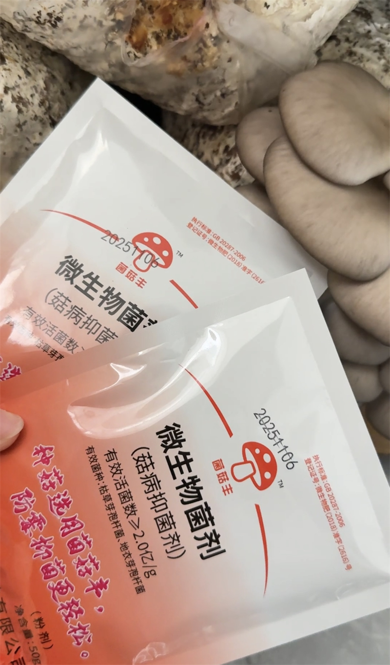 本品是采用现代微生物发酵技术精制而成的专用防虫菌剂,精选兼具驱避与杀虫活性的特异功能菌株。其秉承“以菌驱虫、以菌治虫”的绿色防控理念,通过生物占位与生理代谢双重作用,有效防控菇蚊、菇蝇、螨虫、跳虫等食用菌常见害虫。施用后,活菌体可在菌袋表面及栽培环境中迅速定殖繁衍,其所分泌的生物碱、几丁质酶等代谢产物能有效干扰害虫神经系统、溶解幼虫体壁,从而强力抑制虫卵孵化,阻断幼虫生长,显著降低虫口密度。本品对食用菌菌丝安全无害,不产生药害残留,是实现绿色、有机出菇的必备产品。