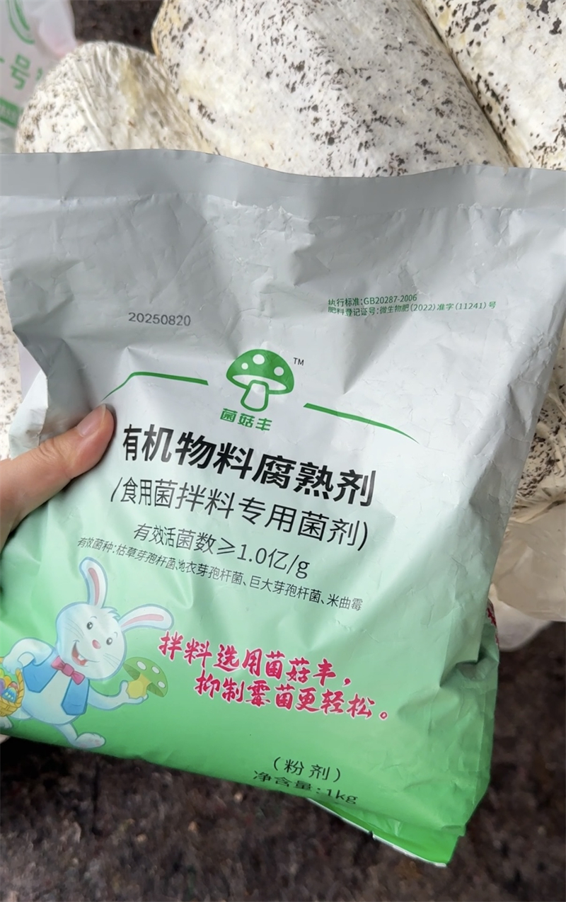 该产品是一款适用于食用菌拌料专用的新一代微生物菌剂,由多种有益菌株配制成的一种复合型微生物菌剂。其作用原理是以菌治菌,抑制霉菌生长,分解培养料中的蛋白质、纤维素,半纤维素,木质素等。该产品有效活性菌含量高,降解能力强,同时能够达到升温、除臭、消除病虫害、杂草种子和提高养分的效果。在适宜条件下能迅速将堆料中的碳、氮、磷、钾、硫等分解矿化,形成简单的有机物,经微生物菌剂发酵腐熟后的堆料,有利于食用菌吸收营养,微生物分解腐熟后的料,更有利于食用菌菌丝生长、提高产量。该菌剂后可有效的抑制食用菌栽培过程中常见的链孢霉、绿霉、黄曲霉等杂菌。